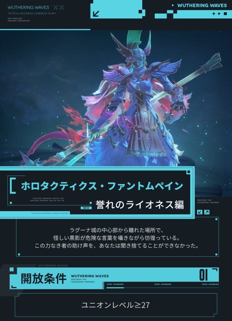 <ホロタクティクス・ファントムペイン>は戦闘力を試すには最適な場所、漂泊者に最も強い相手を提供しています。そしてついに、新たな「ホロタクティクス・誉れのライオネス」チャレンジはVer2.7にて実装予定!#鳴潮#鳴潮2ꓸ7 pic.twitter.com/c5bbHBmxMV